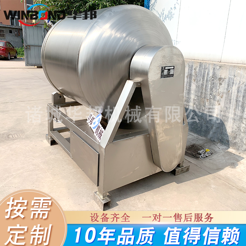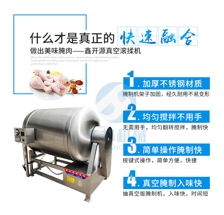 真空滾揉機(jī)在真空內(nèi)具有肺呼吸功能,讓產(chǎn)品在滾筒內(nèi)膨脹、縮小往復(fù)運(yùn)動,改善了肉制品組織的結(jié)構(gòu),提高了切面效果。同時能使添加料(淀粉等) 與肉體蛋白質(zhì)相互融合達(dá)到肉質(zhì)變嫩、口感好、出品率高。