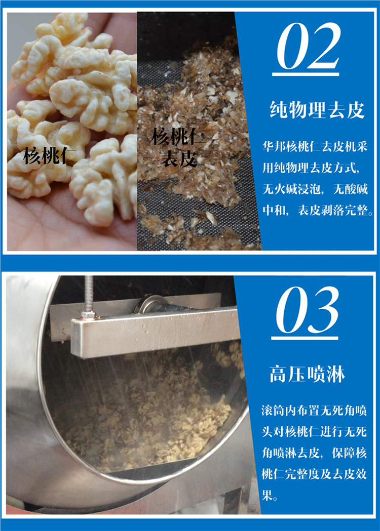 采用特殊設(shè)計的脫皮原理,脫皮過程中,核桃仁完全不經(jīng)過刀片及硬度磨擦用,所以能確保加工物之完整性、新鮮度及無污染。