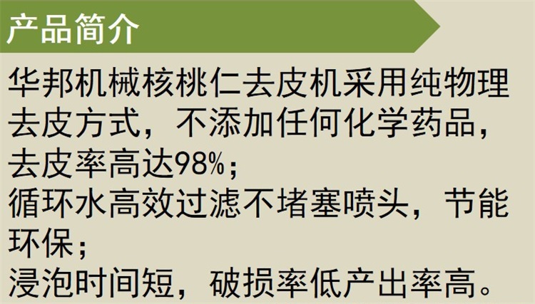 華邦機(jī)械十年的制造經(jīng)驗,根據(jù)多年來的研發(fā),試機(jī),客戶的要求進(jìn)行不斷的完善!最終研發(fā)出了第五代核桃仁去皮機(jī) ,自動進(jìn)料。加大產(chǎn)量,縮短去皮的時間,更容易的將核桃仁皮完全去除!
